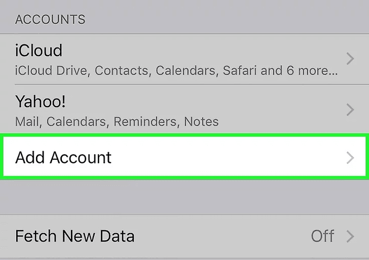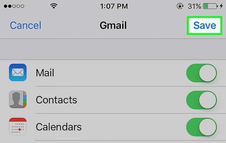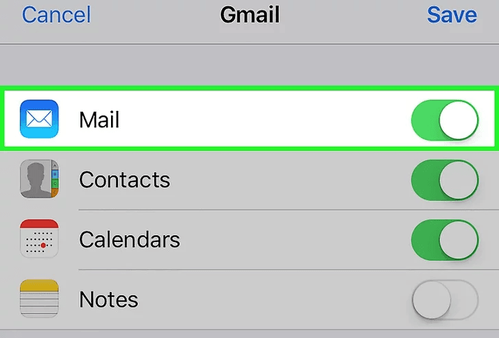 Trượt “Mail” thành “On”. Màu của nó sẽ thành màu xanh lá cây. Chọn các dữ liệu khác tương ứng nếu bạn muốn đồng bộ như Contacts, Calendars và Notes bằng cách trượt thành “On”.